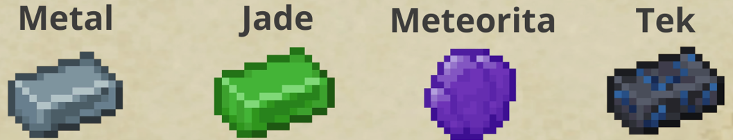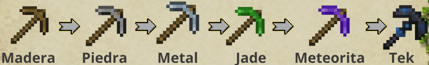 * Pico de Madera → Piedra → Metal → Jade → Meteorita → Tek.