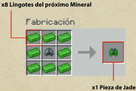* **Piezas de Jade:** 8 Lingotes de Jade + 1 Casco de Metal.