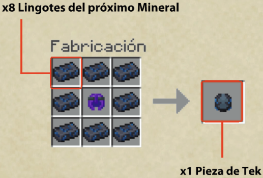 * **Piezas de Tek:** 8 Lingotes de Tek + 1 Casco de Meteorita.